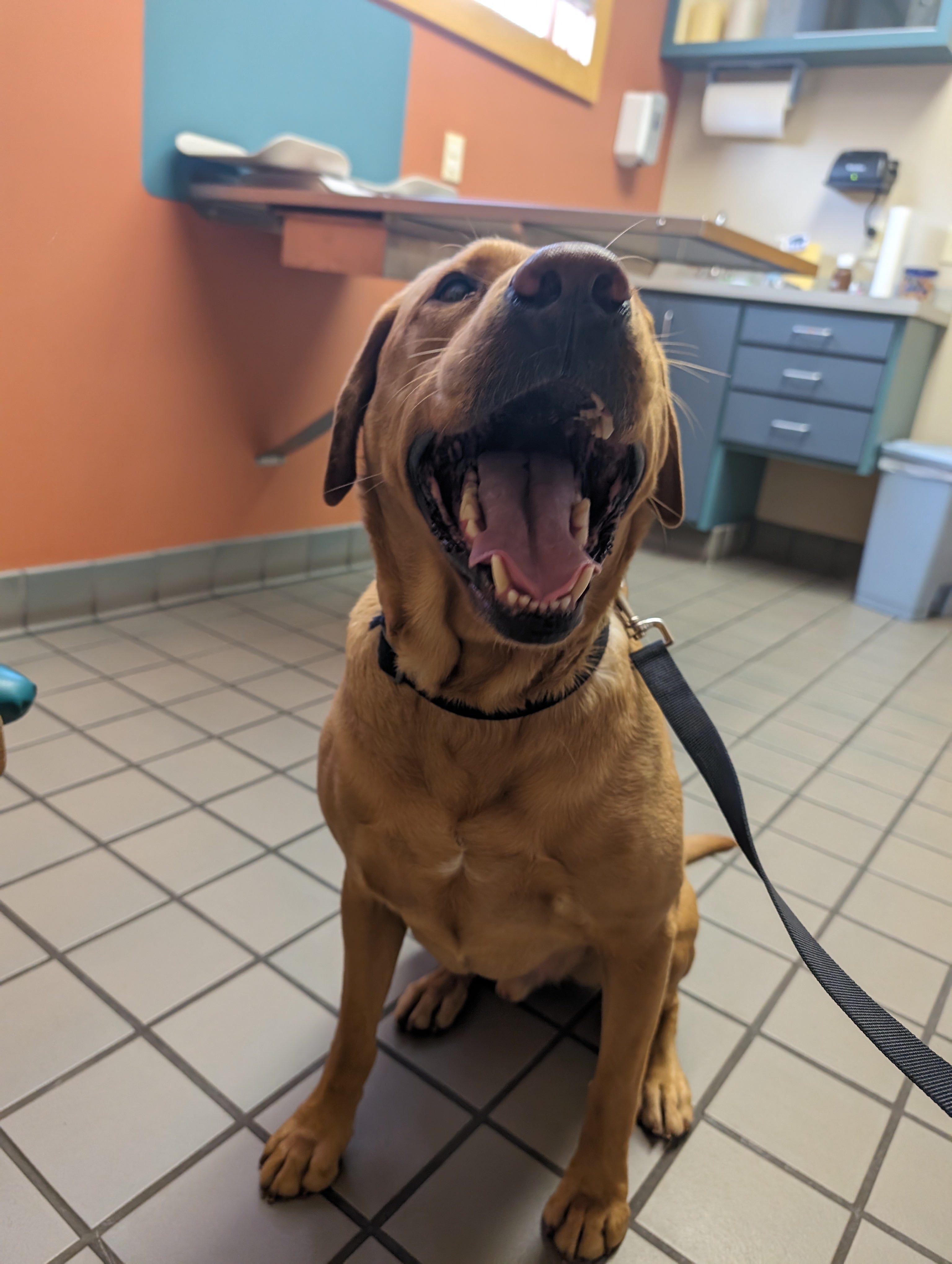 Oberon received a full stamp of health from the vet so he’s ready to run the acres all summer long while mom is watering, weeding and singing to the potato plants.