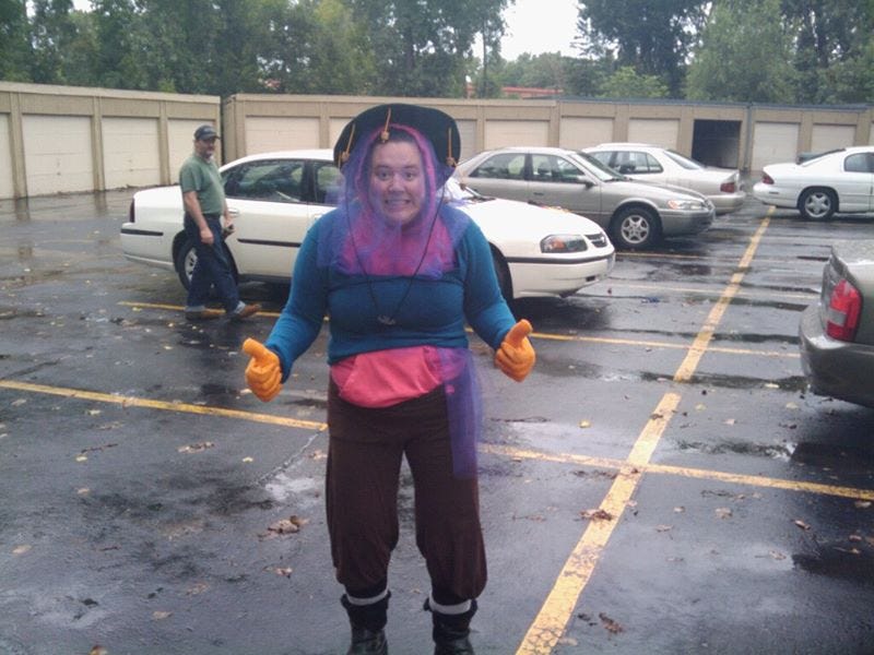 I had layers of hoodies and at least two pairs of sweatpants on. Multiple pairs of socks stuffed into my boots, and random tulle material I found in the closet wrapped around my head and tucked under the hat my dad brought back from a trip to Australia.